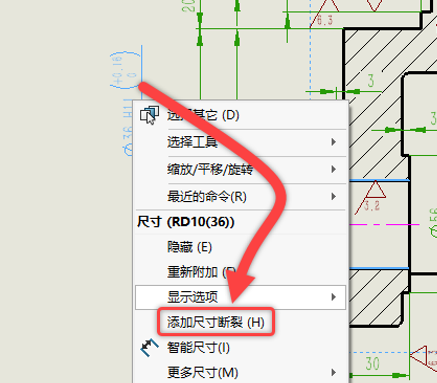 而關于斷裂尺寸線的問題也一直以來困擾著大家,首先是添加方式上缺乏人性化,每一次都需要手動在對應的尺寸屬性管理器中去添加。另外,添加后的斷裂尺寸線只能對尺寸線進行斷裂, 做不到對尺寸文本進行斷裂,這就會導致尺寸與尺寸之間即使添加了斷裂屬性但依然存在干涉的現象!這些問題都已經在 SOLIDWORKS 2026 版本中得到增強,現在我們添加尺寸斷裂效果只需對尺寸執行右鍵菜單即可,減少了很多鼠標使用軌跡,對于尺寸線在尺寸文本的斷裂效果也一并得到改進。