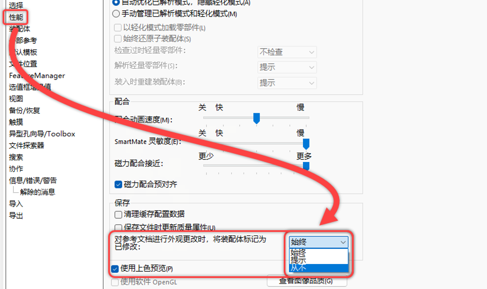 另外一個重大的改進則是:用戶自定義加載裝配體重建方式,可設置對裝配體的重建要求,將不必要的重建動作進行省略。當我們為裝配體中的零部件做如下更改時,可設置在加載裝配體的過程中不重建整個裝配體,事實證明對于這一類模型“外觀”的更新利用完全重建的方式加載裝配體會造成過多的性能浪費!